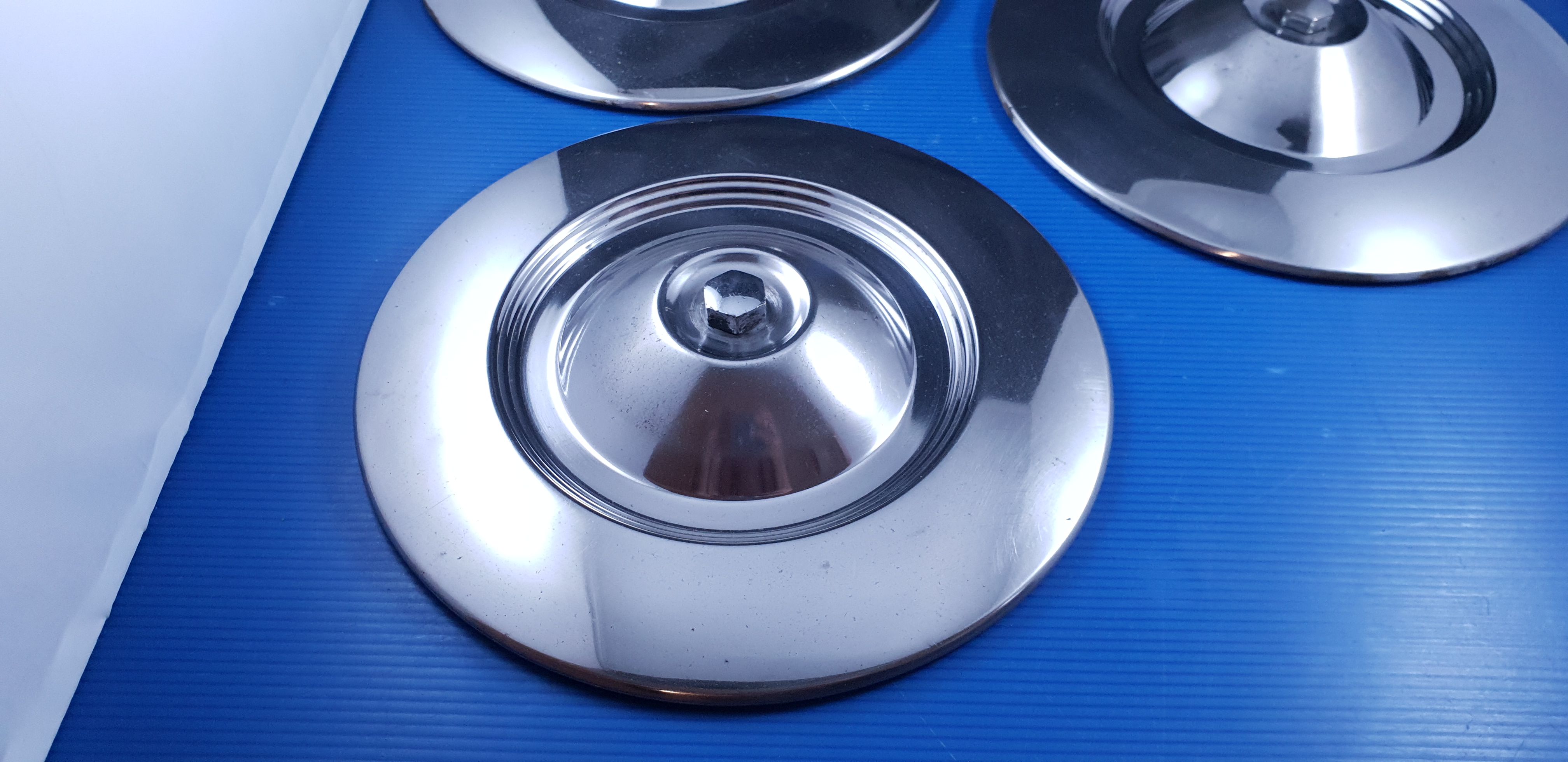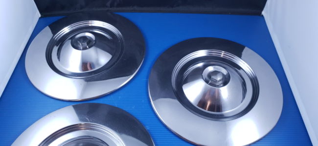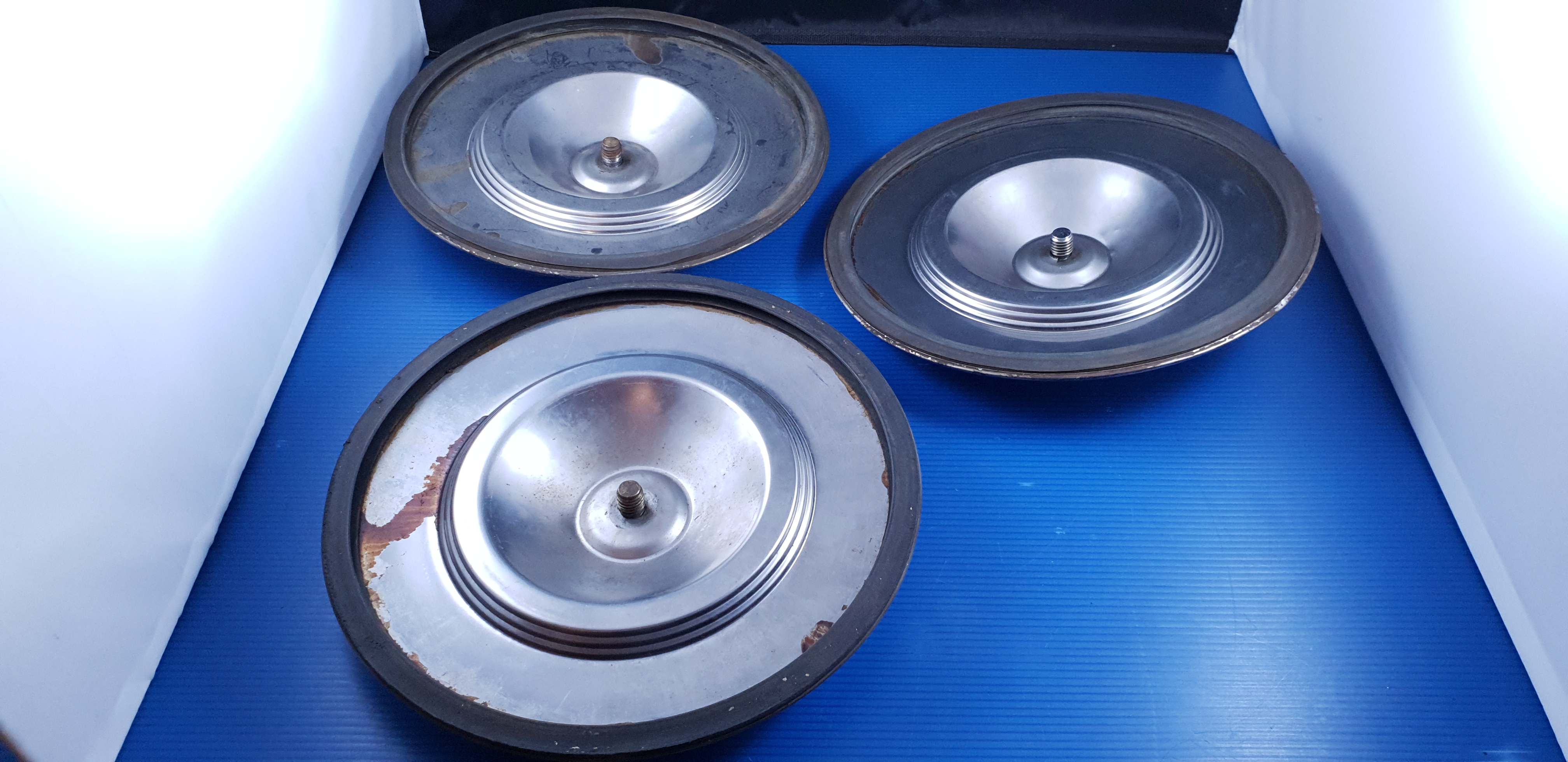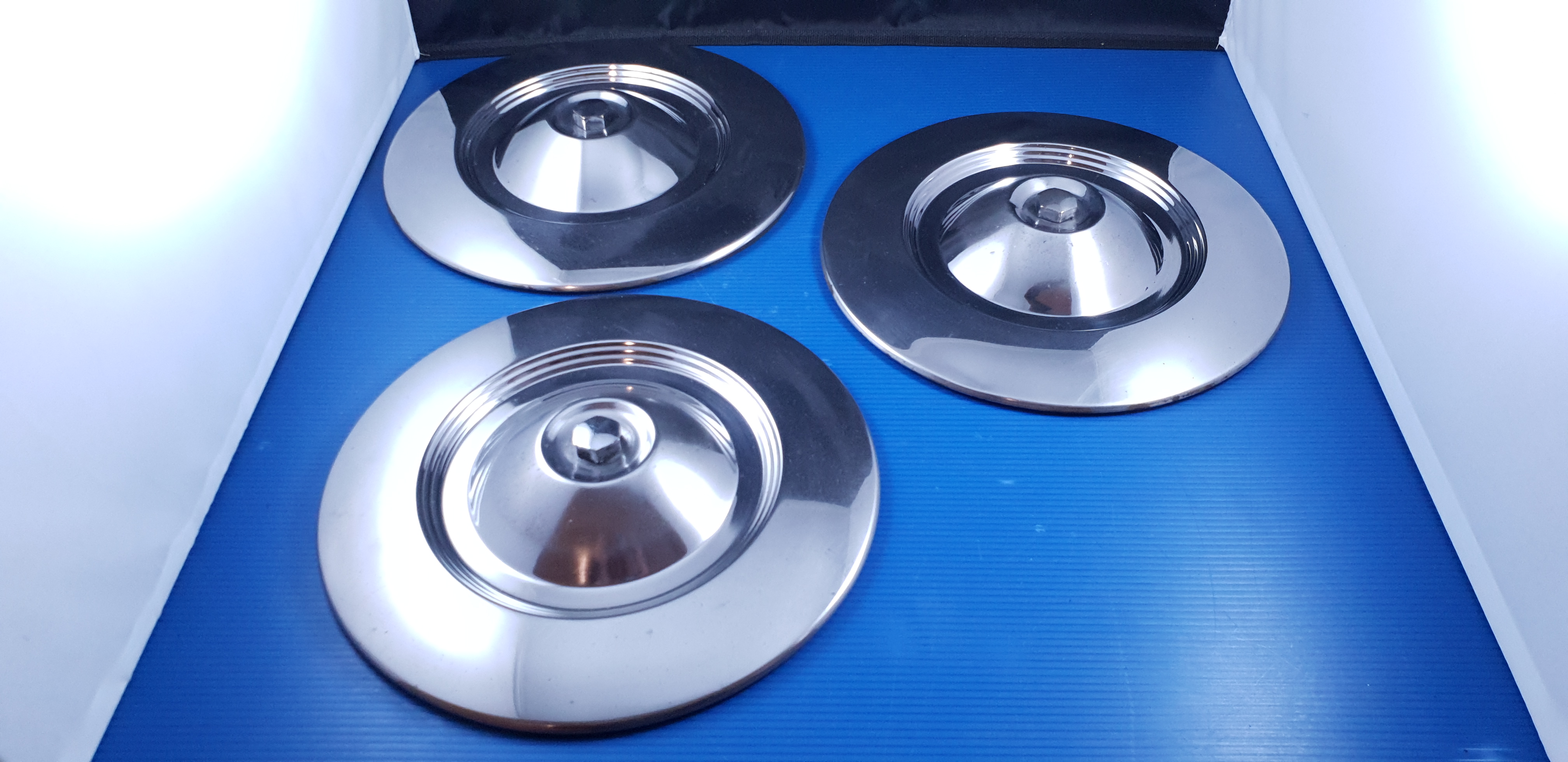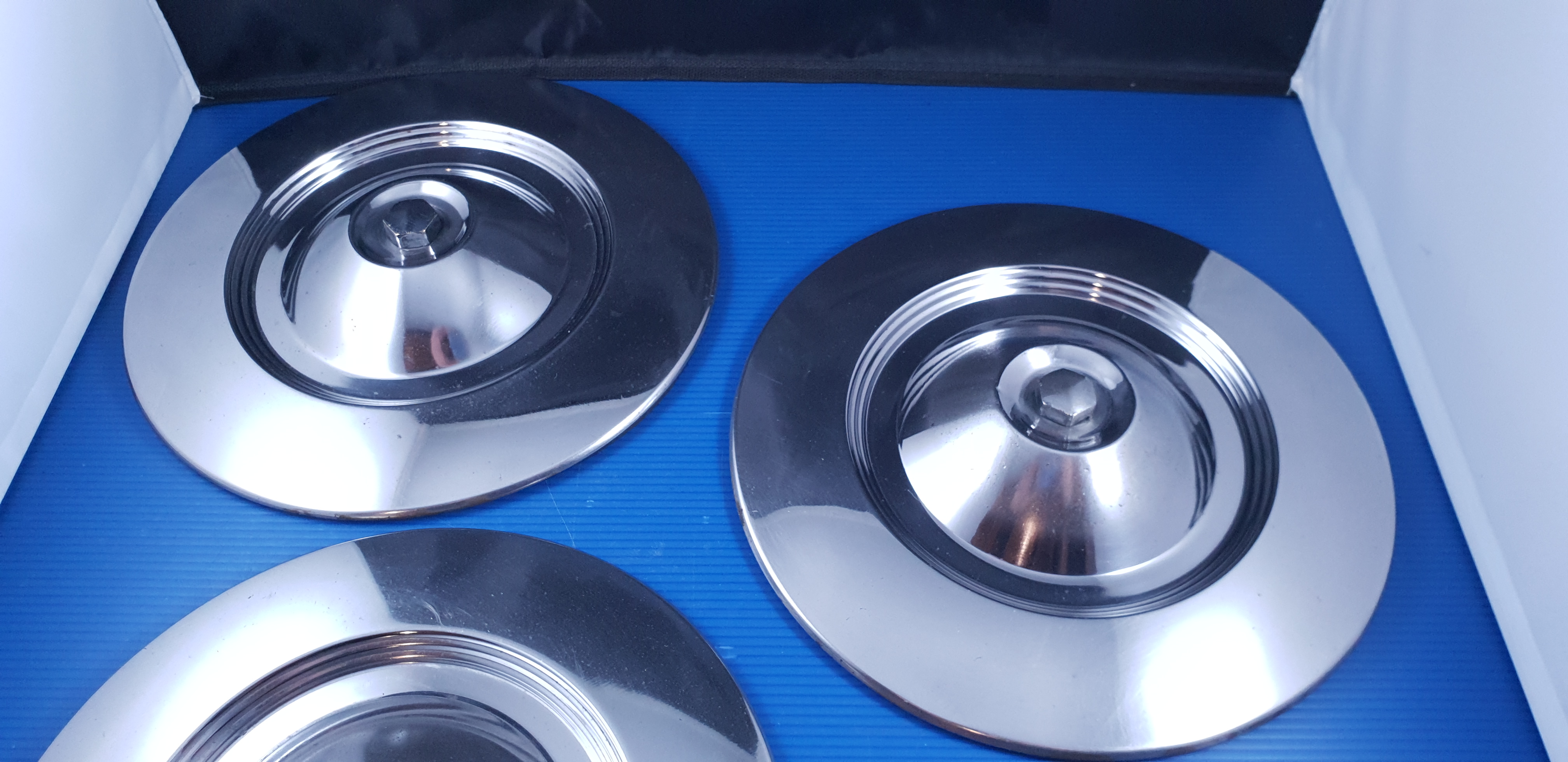 Jeu de 3 enjoliveurs de roue, pièces d’origine d’occasion en bel état, avec boulons et joints.