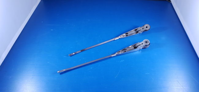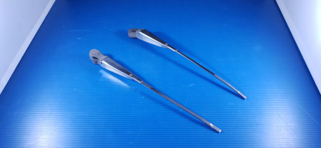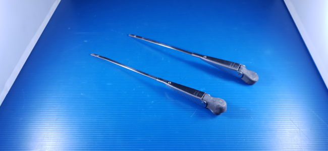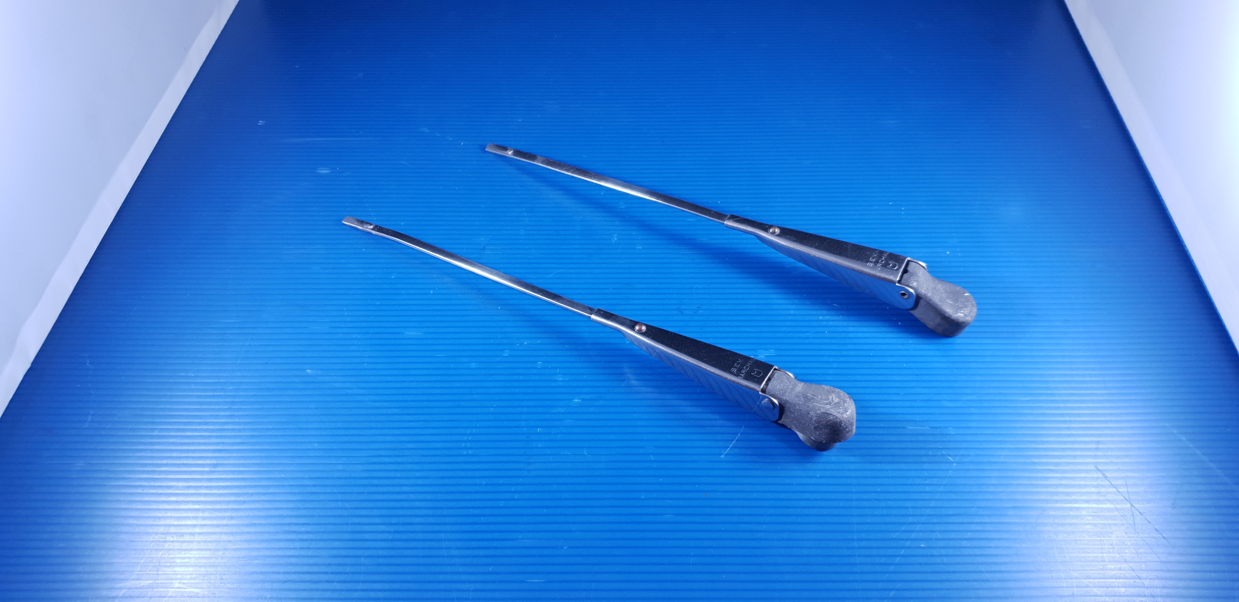 Paire de bras d’essuie glace inox et chromés SEV MARCHAL, pièce d’origine d’occasion en bel état, micro-rayures et un capuchon en plastique un peu coupé.