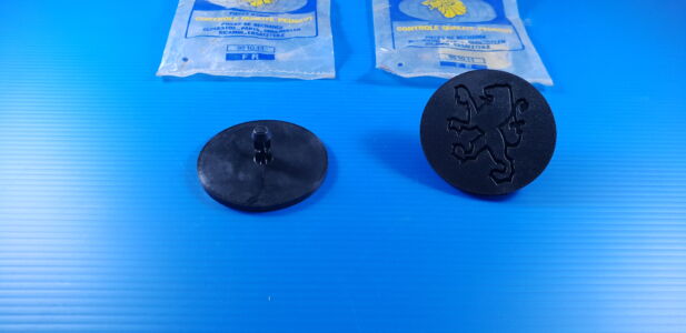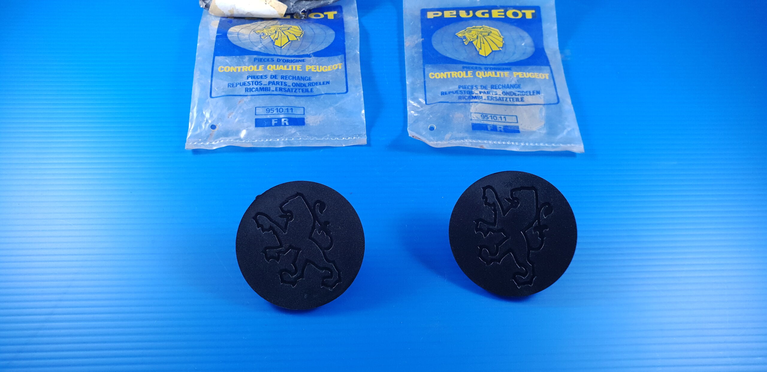 Paire d’enjoliveurs caches centraux de roue avec lion, fixation sur enjoliveur en plastique, pièce neuve d’origine PEUGEOT.